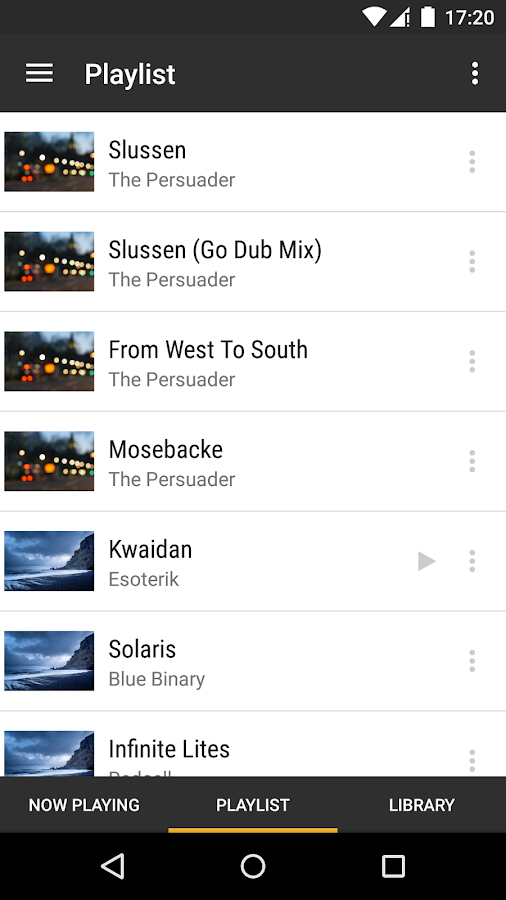 Now I have a new toy -- the Yamaha MusicCast WX-030 network speaker. It's very affordable @ $250. It has its own MusicCast app which allows you to playback from various streaming audio services like Pandora or Spotify, but I've yet to commit to any of those. It also lets you playback from 'Server' (DLNA) but then its track/playlist control is non-existent. Fortunately the speaker also works perfectly with BubbleUPnP. Probably the most important feature of the app is that it allows you to EQ the speaker as well as couples two speakers into a stereo pair.| BubbleUPnP playlist |